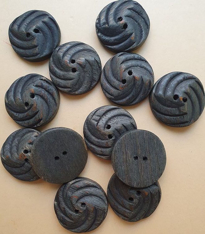 12 handgefertigte Holzknöpfe mit einem Durchmesser von 3,4 cm.