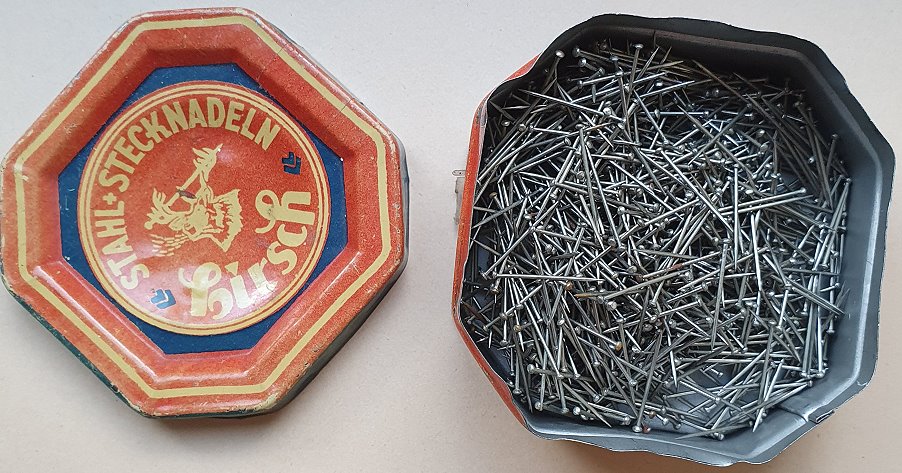 antike Stecknadeldose aus Blech Firmenname Hirsch